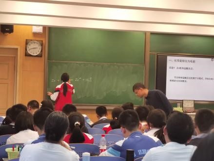 高一年级第二节课是戴建良老师的《化学反应与电能》。学生对于原电池的困惑在于:不理解电流是如何产生的,本次课堂戴老师从锌与盐酸反应的单线桥表达式出发,引导学生直接用锌粒和铜丝放在稀盐酸中做一个简单的实验,让学生看到铜丝一端有气泡,从而让他们明白其中有电子的转移,由此引出原电池的原理、构造。再研究锌氢电池能否在生活中有实际应用,借助历史上的伏打电池,锌锰干电池,锌—空气电池,找出它们的联系,研究锌—空气电池时,让同学自己实验,这样不断扩充学生对电池的认识,最后总结电池发展的历史,非常的巧妙。