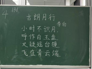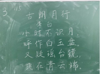 比赛过程中,同学们根据提供的统一书写内容,仔细斟酌作品的结构和布局,把握字与字之间的大小、距离关系,在黑板上全神贯注、有条不紊地进行书写,尽情施展自己的才华。比赛分为上午场、下午场,书写内容分别为《古朗月行》与《鹿柴》。