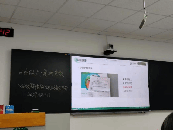 最后,杨琳同学结合两个半月的教学经历、生活体验,从学生的复杂性(集体融入、家庭问题、学习困难、职业规划等),教学的复杂性(教学对象复杂性等)以及支教的意义(给学习条件艰苦的学生带去希望、青春在支教中闪亮、延续教育的力量等)三个方面分享自己的体验感悟。