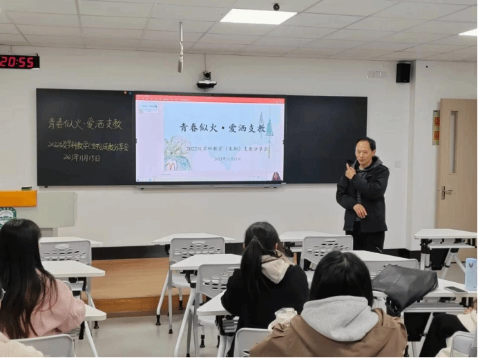 为促进班级同学对杨琳和胡越两位同学支教生活的多方面了解,加强班级同学之间的沟通联系,2023年11月15日晚上,2022级学科教学(生物)班级开展了主题为“青春似火·爱洒支教”的班级分享会活动,本次活动采取线上和线下相结合的方式开展。