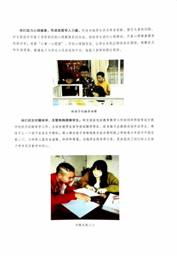 研支团聚焦教育教学主责主业,坚守教书育人阵地,针对不同学段、不同层次的学生进行备课和教研,由研支团指导老师定期开展线上培训,给成员们答疑解惑和方法指导;助力学生心理健康,通过组织心理测试、建立心理辅导室等方式搭建与学生心灵对话的平台;抓实控辍保学工作,为特殊儿童送温暖、送知识、送希望;注重学生全面发展,充分开展多彩活动,在潜移默化中拉近支教志愿者们与学生之间的距离,扎实开展支教帮扶工作,助力乡村教育发展。