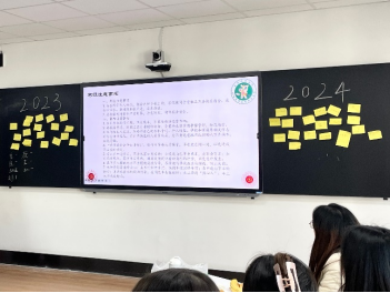 每位同学在便利贴上写下自己本学期的个人小结和下学期的未来展望,并张贴在黑板两侧。有同学表示在本学期学到了很多,有许多收获,并对下学期充满期待,希望在未来的日子里能够“拨云见日,喜乐安康”。