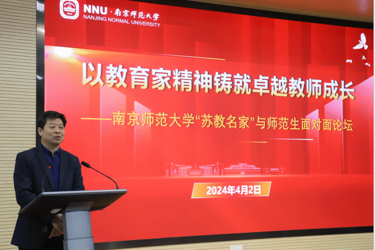 张连红在致辞中对“苏教名家”的到来表示了热烈欢迎,同时列数了南京师范大学在120多年校史中的知名教育家,指出他们笔耕不辍、培育后学的“厚生”精神是南师人宝贵的精神财富,希望同学们进一步弘扬教育家精神,珍惜与“苏教名家”面对面交流的机会,卓厉奋发,砥砺前行,努力成长为新时代的“四有”好老师,为教育强国和中华民族伟大复兴贡献力量。