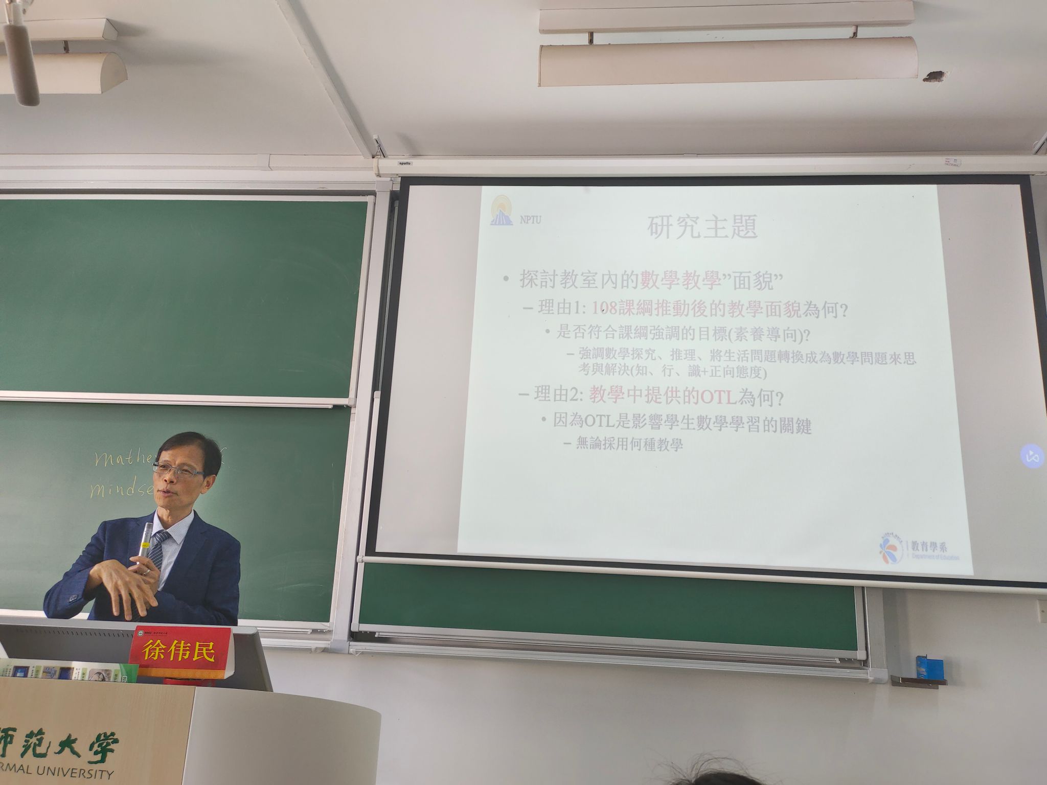 2024年4月9日下午,第五十六期“随园师话”教师教育学术创新论坛邀请到台湾屏东大学教育系教授徐伟民来我校开展了以“从100节数学课看数学学习机会”为主题的报告。顾继玲老师与朱晨菲老师以及全体23级学科教学(数学)研究生参加了本次报告,报告由朱晨菲老师主持。