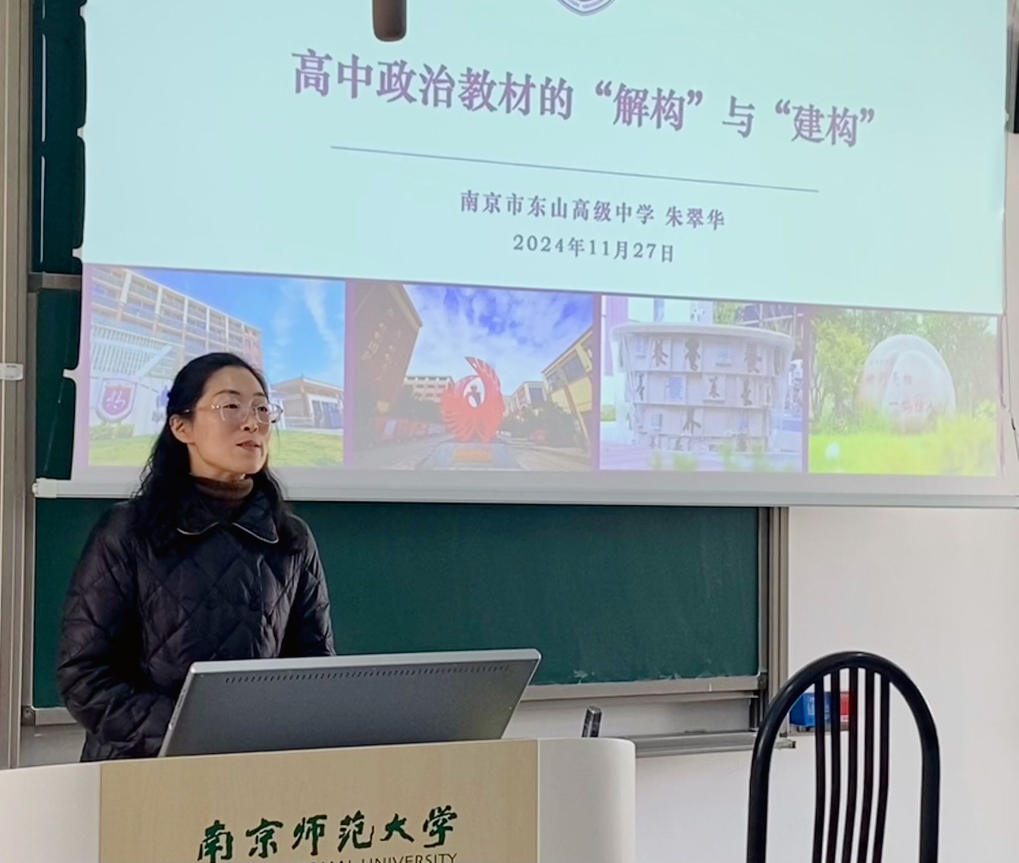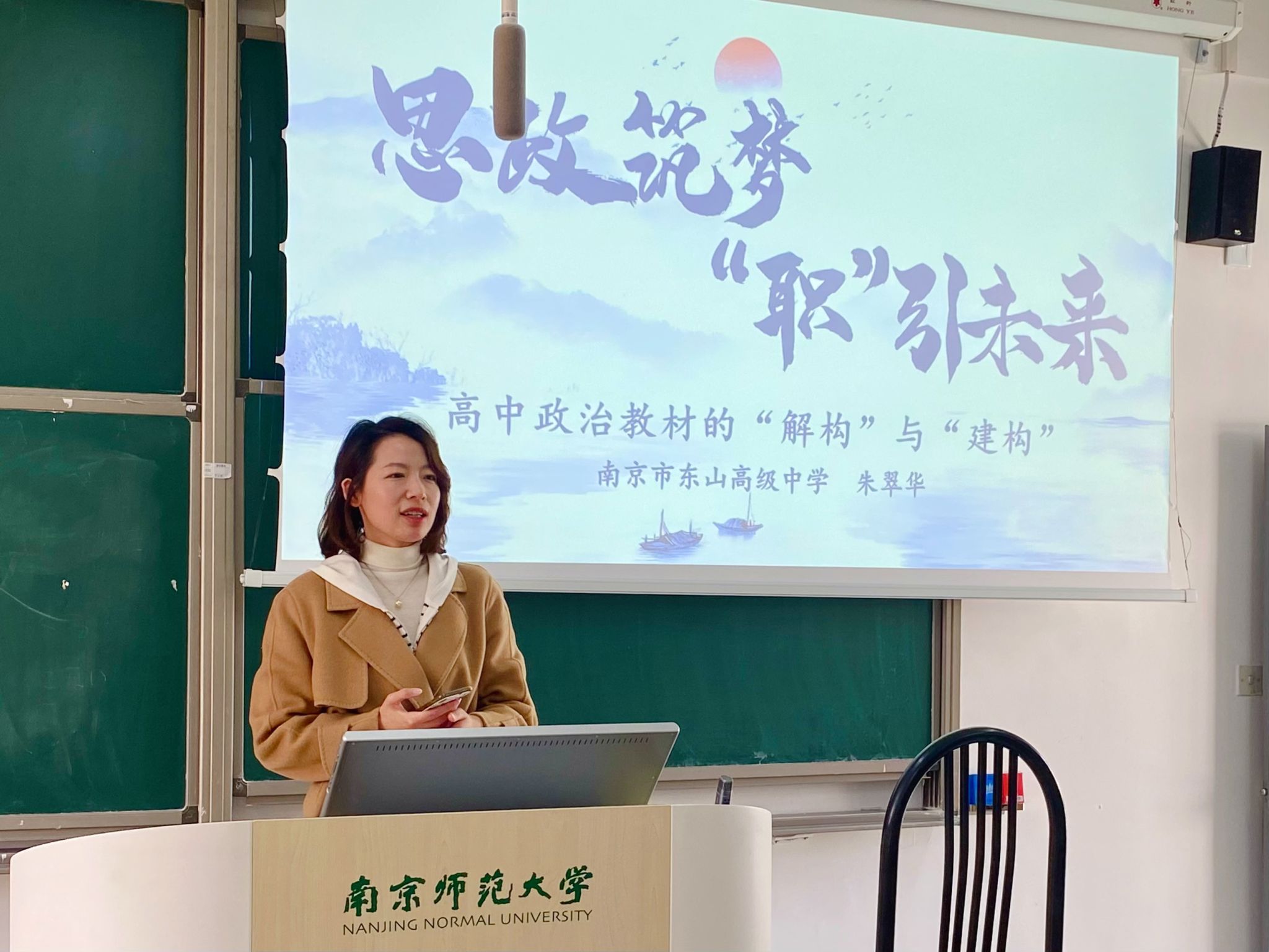 2024年11月27日,23级学科教学(思政)班成功举办“思政筑梦,‘职’引未来”主题讲座。本次讲座聚焦于对高中政治教材的解读和梳理,旨在帮助同学们更深入地理解课程内容,把握当前教育形势,并有效开展教学实践。此次讲座邀请到南京市东山高级中学副校长朱翠华老师作为主讲嘉宾,朱老师是高中政治高级教师,南京市政治学科中心组成员,现任东山高中副书记。先后被评为江宁区学科带头人、南京市优秀青年教师。荣获江苏省优质课评比一等奖第一名、2010年全国思想品德优质课评比特等奖,2021年南京市高中政治优质课评比一等奖,她具有初一到高三政治学科的大循环教学经历,教育教学成绩优异。此次讲座由班主任王鑫老师主持,22级、23级和24级思政班同学共同参与。