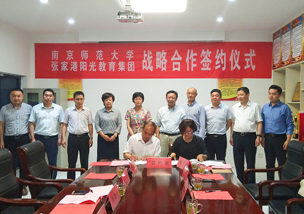 我校发展委员会主任姜国定和钮加伟分别代表南师大与张家港阳光教育集团签署了战略合作协议。南师大附属实验学校副校长薛海丽和滁州阳之光高级中学校长高乾龙签署了合作举办南京师范大学附属实验学校国际部滁州分部的协议。