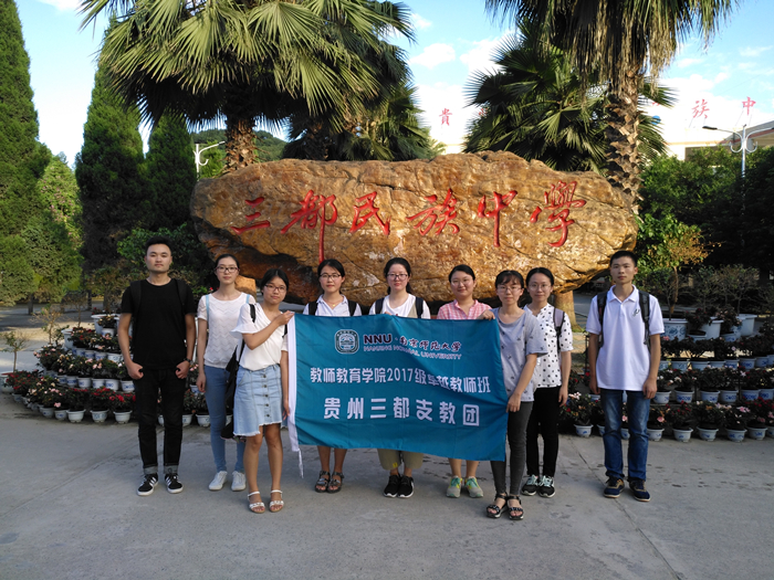 由斯涵妮等9位同学组成的贵州三都支教团则于2017年7月8日至7月20日在贵州省三都水族自治县进行支教活动。在带队教师邱莉老师的组织下,支教团先为三都县鹏城希望学校的初中学生带去了形式多样、内容丰富的主题课程活动,例如“数学其实可以很有趣”、“文学知识知多少”、“科学与人文漫谈”等等,开拓了孩子们的视野,在欢声笑语中吸收新鲜知识,激发他们的学习积极性和创造性。随后一行人来到三都县民族中学,以实习班主任和实习学科教师的身份进入班级,与准高三学生度过了充实的六天时间。9名同学按学校职工上下班时间全面体验了教师生活,也详细了解了班内学生们的学习情况和心理状态。学生们依依惜别时的真挚目光和淳朴笑容,让支教团的所有成员真真切切地体会到了教师职业幸福感。