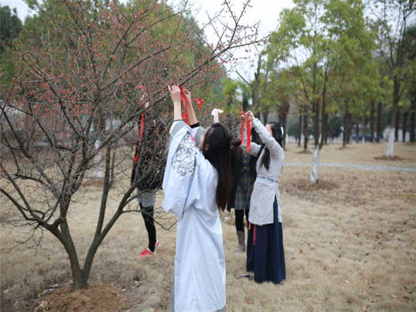 近日,在南京师范大学仙林校区东区草坪上,青年学子举行了女生节汉服祈福活动,三月微冷的春风中,汉服的古韵与红梅的清丽相映成趣。