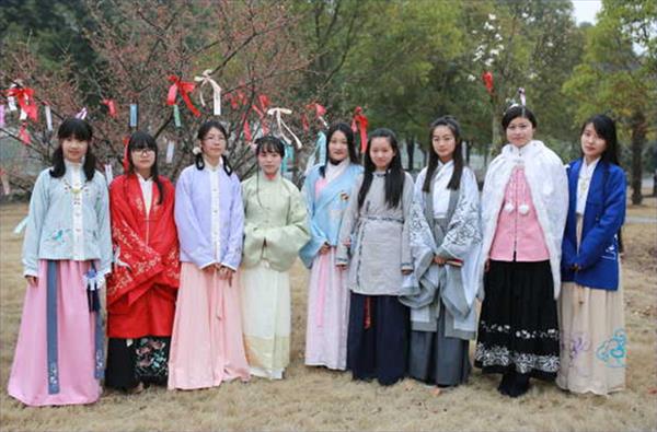立领、对襟、褙子、襦裙,各种的汉服被南师大学子演绎出独特韵味。10名身着汉服的少女或翘首南望,或踮脚祈祷。而写有“祝家人身体健康”“希望男朋友今年浪漫一点”的彩色缎带,则在初寒料峭之中增添了一抹温情。