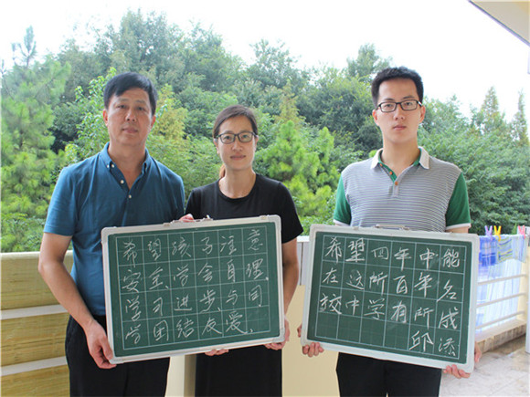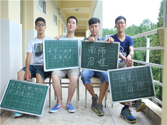 的志愿者也让同一宿舍的四位新生在小黑板上写下对未来四年的师院生活的期待以及想对舍友说的话,并为他们拍下合影,以此展现师院特色。
