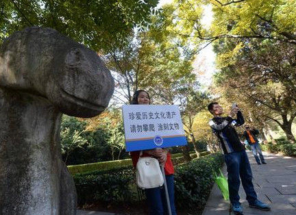 〖现代快报〗南师大志愿者举牌劝阻景区不文明行为 发布时间:2015年10月19日 13:52:13 阅读次数: 字号:[ 大 | 中 | 小 ] 背景色: 昨天早上9点多,现代快报记者来到明孝陵的石象路。眼下正是秋高气爽,部分树叶已变得红红黄黄,阳光透过叶子的缝隙洒在静默的石兽身上,风景宜人。 不过,这么美的画面却有些不和谐的因素存在——石象路沿途分布的12对石兽,有不少已经被游客“占领”了,有的利用石兽锻炼身体,有的则干脆抱着孩子坐上去,合影留念。 看到此景,南师大博彩网址大全 的志愿者走上前去:“您好,这是世界文化遗产,已经600多岁了,你们这样属于不文明行为,会伤害到文物的。”听到志愿者的劝阻,这名游客方才停止了拍照。(记者:姚茜)
