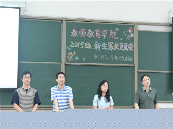 在学明楼202教室举办了2015级新生家长见面会。教师院常务副院长杨作东教授、党委书记张杰老师、党委副书记江胜尧老师、副院长周晓静老师和教师院团委副书记、15级辅导员翟云秋老师、李晓亮老师出席了本次家长会,家长会由教师院党委副书记江胜尧老师主持。