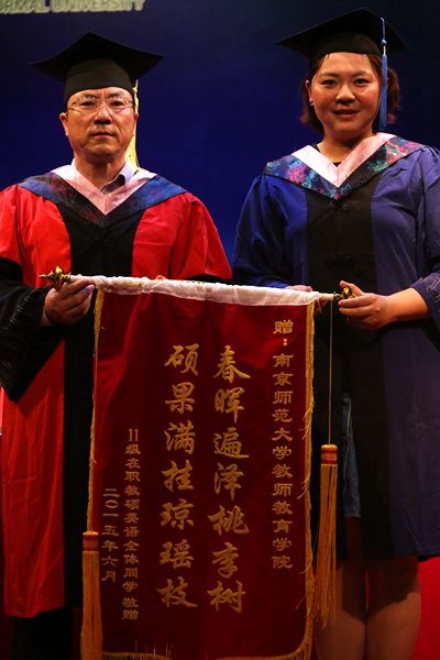 学位授予仪式和颁奖典礼结束后,由师生代表发言。实践导师代表、南师大附属中学孙小红老师,学科导师代表肖晓燕老师满怀深情的寄语、语重心长的鼓励、依依不舍的离别之词,朴实无华的期望打动了现场的每一个人。全日制毕业生代表丁洋同学和在职毕业生代表殷林军同学发言,他们对母校无限的热爱、留恋和祝福,说出了每一位毕业生的心里话。值得一提的是,事先并没有预知的惊喜:在职毕业生代表讲话结束后,在职毕业生硕士向学院献上了锦旗,表达了对学院的感谢与祝福,杨作东院长代表学院接受了锦旗。