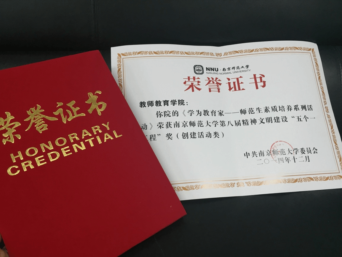 《学为教育家——师范生素质培养系列活动》荣获南京师范大学第八届精神文明建设 “五个一工程”奖(创建活动类)。为进一步加强我校精神文明建设,巩固精神文明建设成果,我校今年共评选出第八届精神文明建设“五个一工程”奖获奖成果23项。