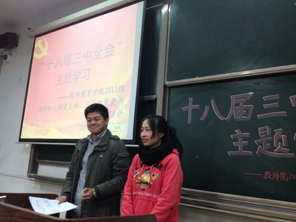 随着冬天的脚步渐渐临近,寒冷的气息已渐渐在校园里蔓延,而在12月3日傍晚的北区教学楼203教室里却是热情高涨,由教师院13级研究生两年制文科班党支部及三年制党支部共同组织的以学习“党的十八届三中全会”为主题的民主生活会正在这里如火如荼的进行着。会议由两年制文科班支部书记庞骏及三年制支部书记孙欢主持,两个支部的全体正式党员及预备党员一同参与了此次会议。