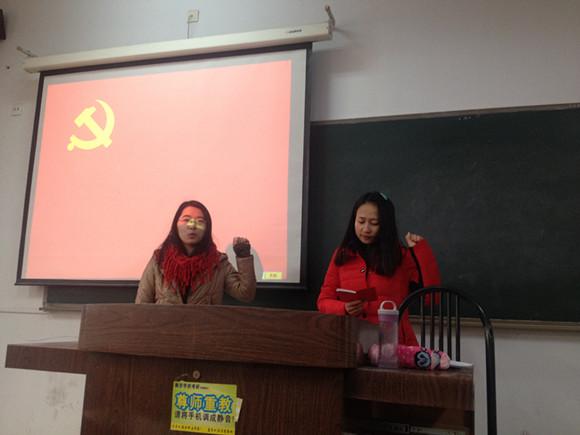此次大会申请人为李文艳同学, 大会开始之际,在庄严的国际歌奏响之后,李文艳同学进行入党志愿书的宣读,表明了自己的入党动机,表达了对党组织的向往,对党的忠诚。她表示在成为正式党员之后,会坚定不移跟党走,为党组织工作付出自己的力量,为共产主义事业奋斗终身。紧接着,李文艳同学的两位入党联系人陆迎迎同志和夏雪同志对于李文艳同学的情况作了初步介绍,他们表示李文艳同学在转正期间表现优秀,建议组织按期给与转正。此后,其他党员对李文艳同学的转正申请发表了自己的看法,其舍友沈婷同学表示李文艳同学平时乐于助人,在宿舍像大姐姐一样关怀他人。黄霞同学从生活当中的小事出发,详述了李文艳同学平时朴实无华的作风。在党员们各自发表意见之后,实到的十三位正式党员对转正同学进行了举手表决,在高亢激昂的宣誓仪式之中,李文艳同学从预备党员顺利转为正式党员。