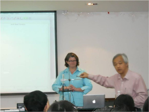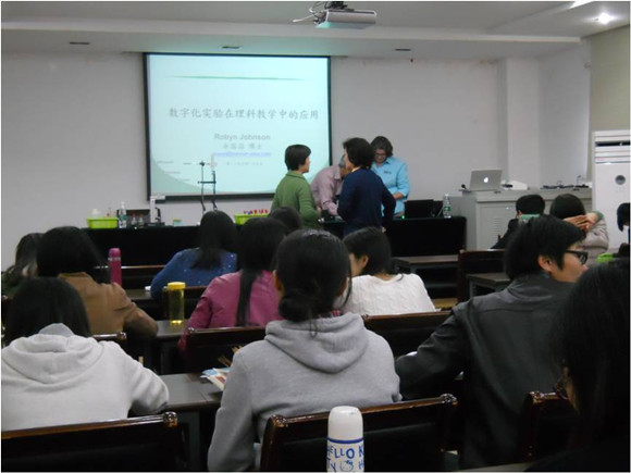 传感器的类型等,让同学们对数值化实验有所了解,然后演示了如何运用数据采集器结合位移传感器和光强传感器的进行数字化实验。余博士所做的两个实验让同学们深切地感受到了数字化实验相对于传统实验的优势。随后Roby女士向同学们演示了中和滴定、色度分析等四个数字化化学实验,Roby女士连续十余年在美国科学教师学会年会上主持数字化实验工作,经验十分丰富,同学们在精彩的实验中进一步感受到了数字化实验的魅力。