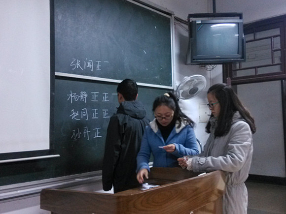 演讲结束后,同学们以不记名投票的方式写下自己心中的人选,并在讲台上由两名同学唱票,一名同学计票,公开透明地进行民主选举。最后,杨静、赵同、张闻同学成为了本次发展党员的推荐人选。此次2013年发展党员民主评议大会在同学们的支持下圆满结束,同学们也将积极贯彻党的主张,学习党的精神,努力学习,热爱生活,在点滴生活中注入自己的青春与热情!