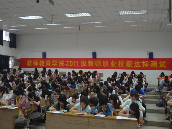 党委书记朱冬梅老师和院团委副书记、11级辅导员翟云秋老师,以及其他教师技能各专业老师组成了考核领导小组,亲自莅临测试现场,担当测试评委。教师院全体11级学生参加了此次测试。