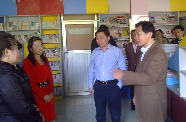 在各实习学校,夏校长和杨局长一行首先听取了各实习学校领导介绍和实习学员汇报。实习学校的领导们都高度赞扬了双语骨干教师们在教育实习过程中的学习热情,高度肯定了少数民族老师们高度的责任心和扎实的教学素养,以及体现出的互助友爱、民族团结的精神,夏校长则亲切地询问学员们的实习收获和感受,帮助学员梳理总结在教育实习过程中所获得的教育教学经验,从教学模式、教学方法、到师德师品、校园文化……在轻松幽默的气氛中,夏校长娓娓道来,学员们或会心微笑,或认真记录,获益良多。市教育杨局长也以亲身经历谈了他对新疆教师的友谊情结,并对进一步做好后续的教育实习工作做了具体的指导。