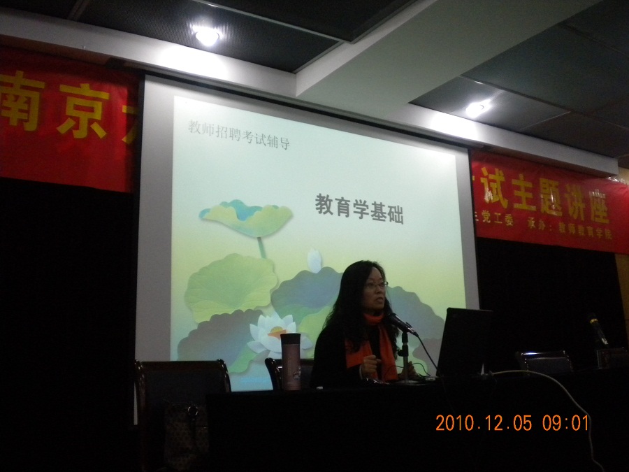 此次讲座是2010“研师论道”研究生教师风采系列活动之一。为帮助我校研究生熟悉考试内容、梳理相关知识点、充分做好笔试和面试准备,讲座分为“教育学考试要点与应试技巧”、“心理学考试要点与应试技巧”和“教师礼仪与面试技巧”三个部分。