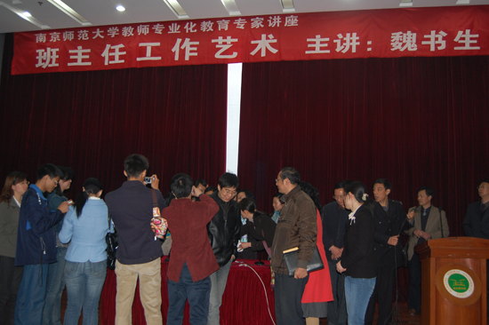 2008年4月6号上午,全国优秀班主任、全国劳动模范、首届全国十大杰出青年、全国中青年有特殊贡献专家魏书生老师在南京师范大学敬文图书馆东报告厅为南京师范大学师范专业学生做了一场题为《班主任工作艺术》的专题报告。南京师范大学敬文图书馆东报告厅济济一堂,掌声四起。