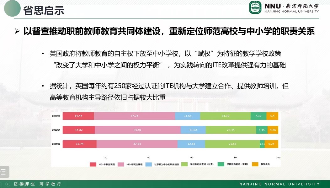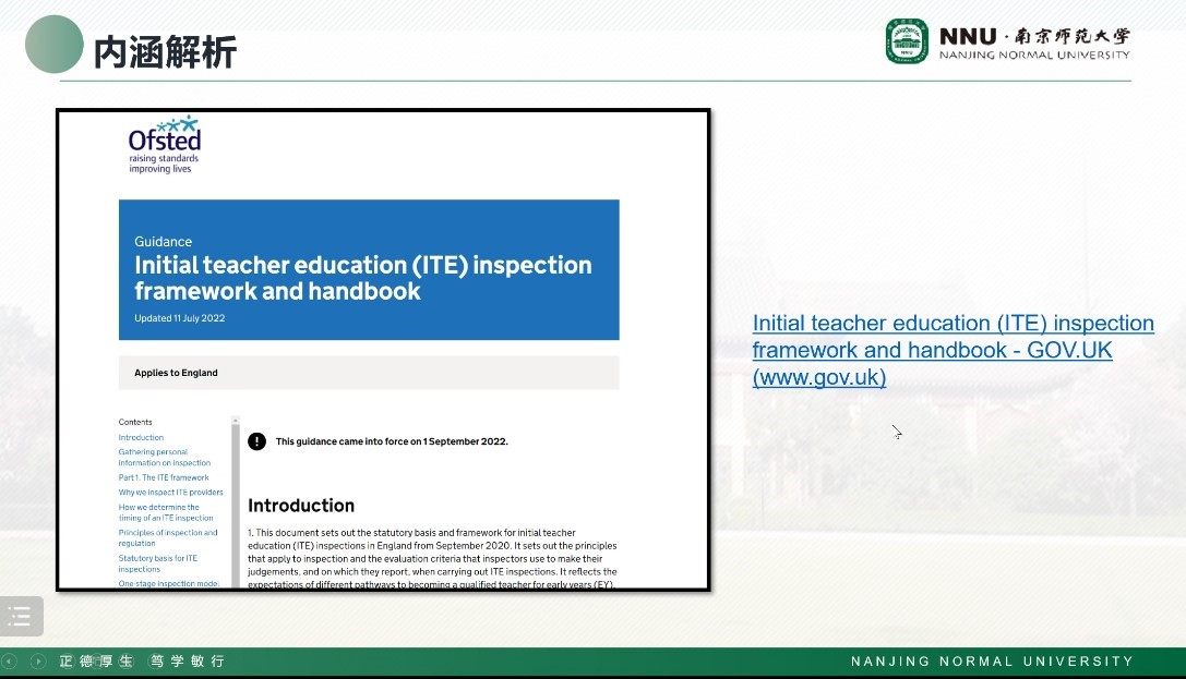 拓宽国际视野,从教育研究者的角度剖析英国职前教师教育督察的意义,龚老师指出,ITE手册的实施是以督察推动职前教师教育共同体建设,重新定位师范高校和中小学的职责关系,优化职前教师教育质量保障体系,保障督察框架与规范细则的落实。