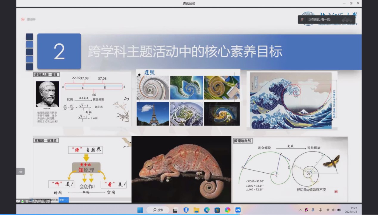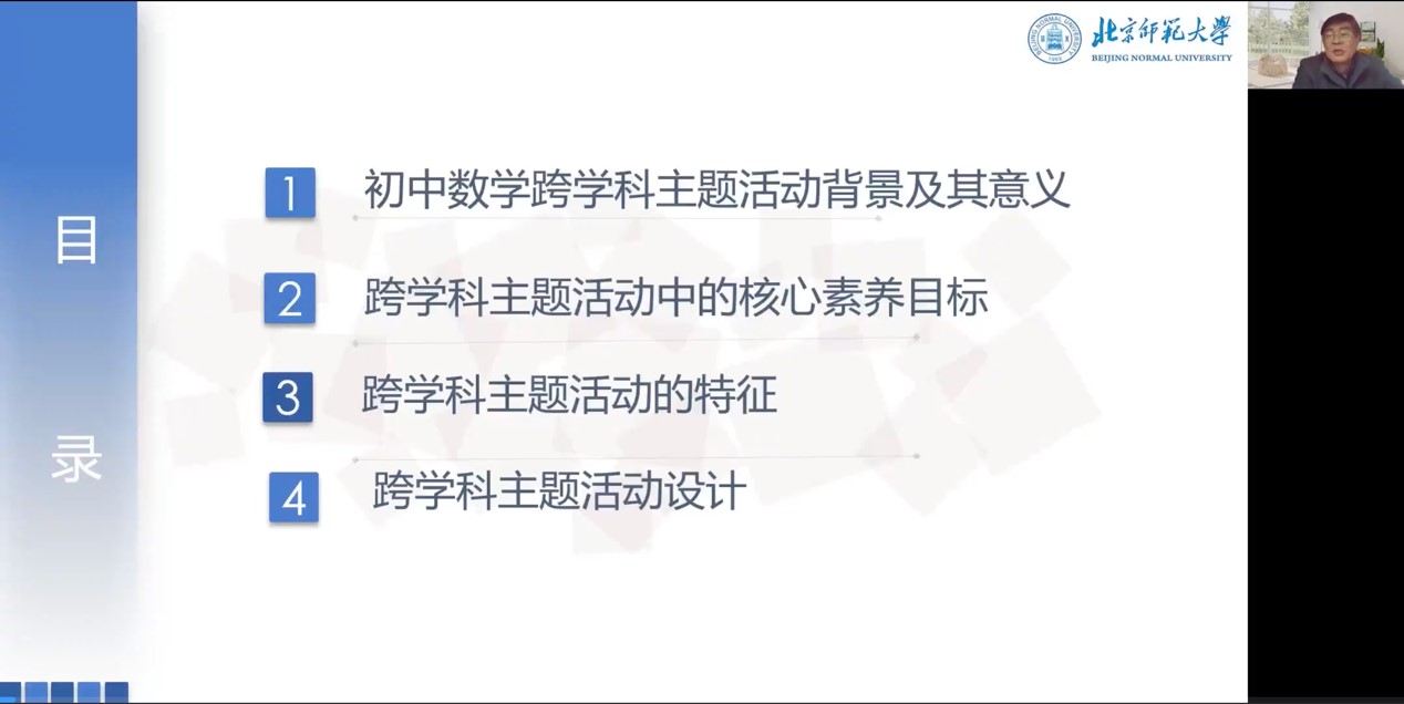 本次讲座中,曹老师主要从初中数学跨学科主题活动背景及其意义、跨学科主题活动中的核心素养目标、跨学科主题活动的特征以及跨学科主题活动设计四个方面进行讲授。