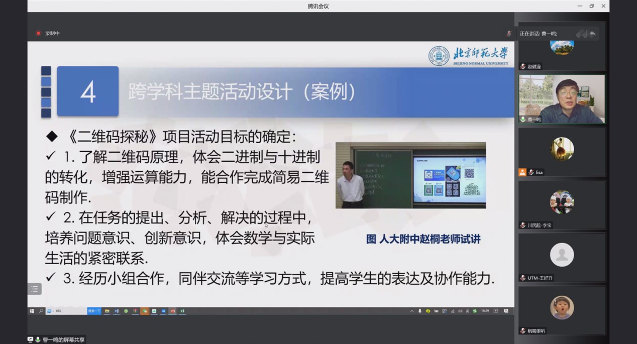 最后,曹老师介绍了跨学科主题活动设计的一般路径,从活动主题的选取、活动目标的目标、活动内容的设计和教师指导四个方面进行具体的阐述,并针对北京冬奥会数学问题、二维码的探秘等几个典型案例进行了讲解和剖析。