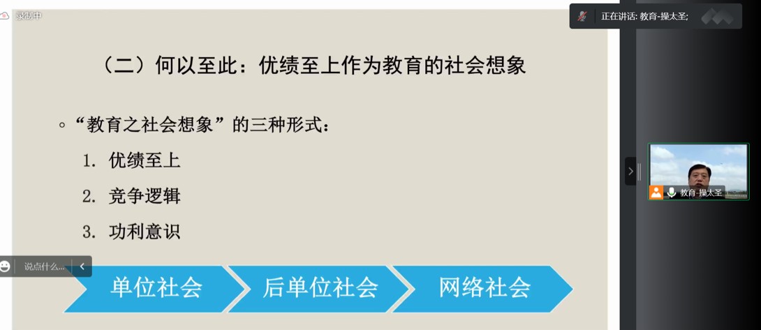 做了一场有关“双减”政策的线上讲座,操太圣教授围绕《国务院关于有效减轻过重作业负担和校外培训负担,促进义务教育阶段学生全面健康发展情况的报告》为学生们讲述了“双减”政策的相关内容,学生们都受益匪浅。