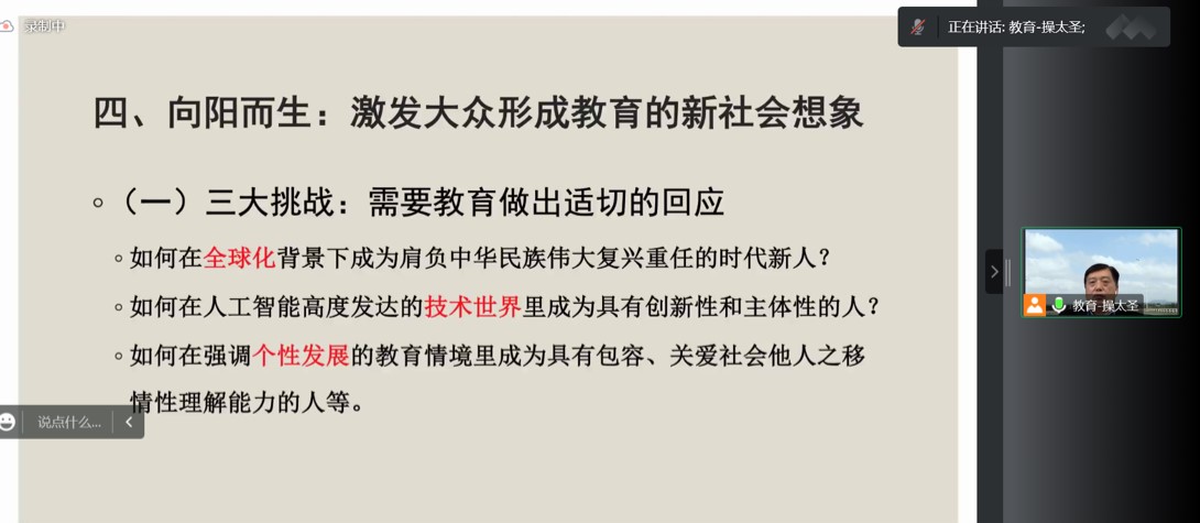 最后一部分内容提出在继续加大力度实施国家相关政策的同时,改变教育等有关概念的社会想象,重塑人们关于儿童与成人的想象,以及人们关于教育与社会的想象。操太圣教授总结了现在需要教育做出适切回应的三大挑战,并就此分享了自己的思考与看法,让学生们对进一步落实“双减”政策的基本思路有了更深入的理解和认识。