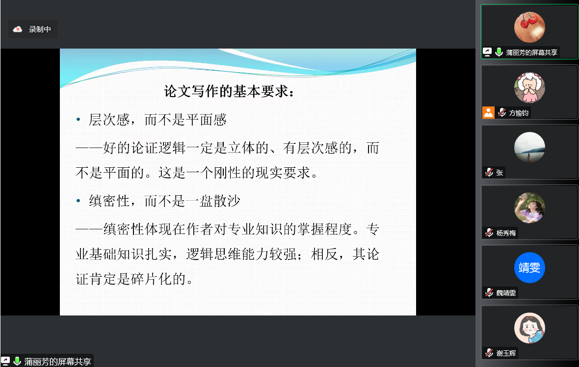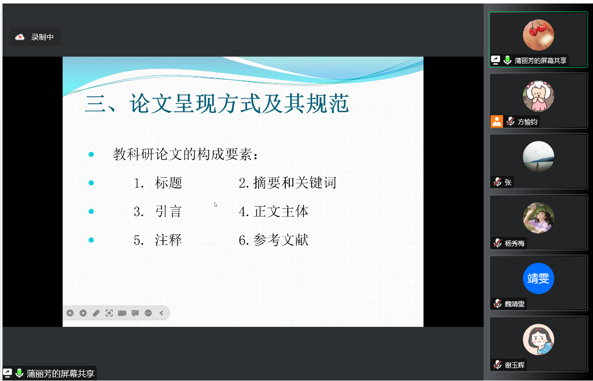 副院长刘建主持。蒲丽芳老师围绕论文在写作过程中的主要关注点与要求、论文写作的基本思路、论文呈现方式及其规范进行分享。在论文的实际写作方面,帮助教师和学生提升论文撰写水平。