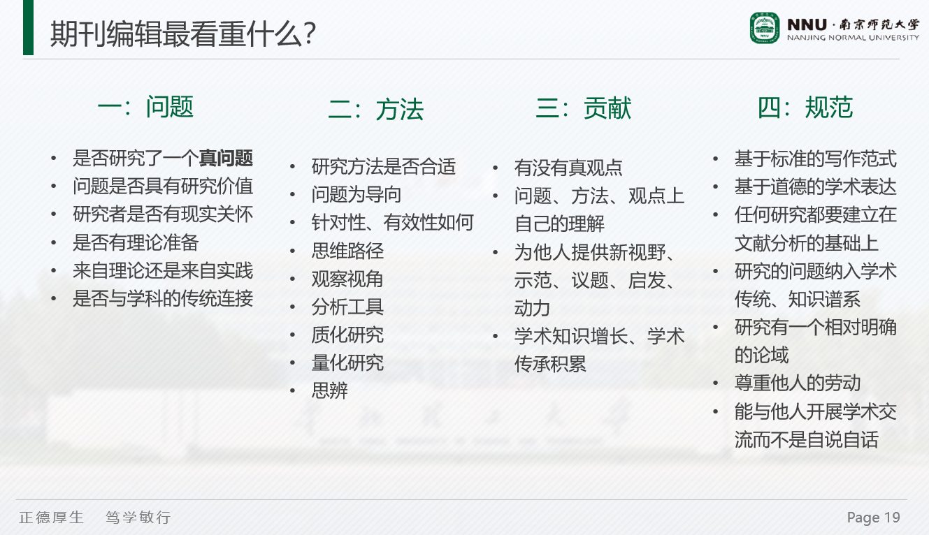 在论文写作的过程上,周教授具体阐述了历史研究法、调查研究法、个案研究法、行动研究法等研究方法,随后向大家介绍了投稿流程:酝酿情绪,发现问题,提炼选题,开展研究,开始写作,反复修改,尝试投稿,等待发表。
