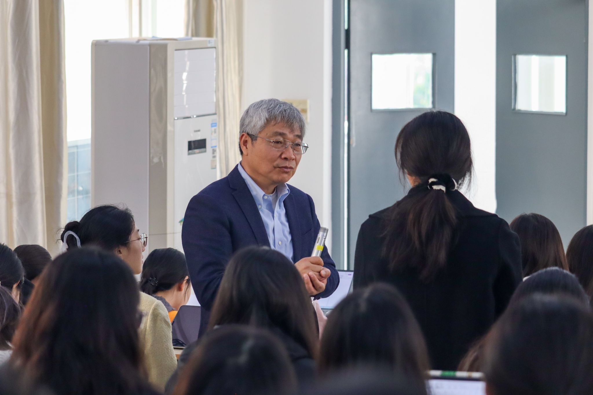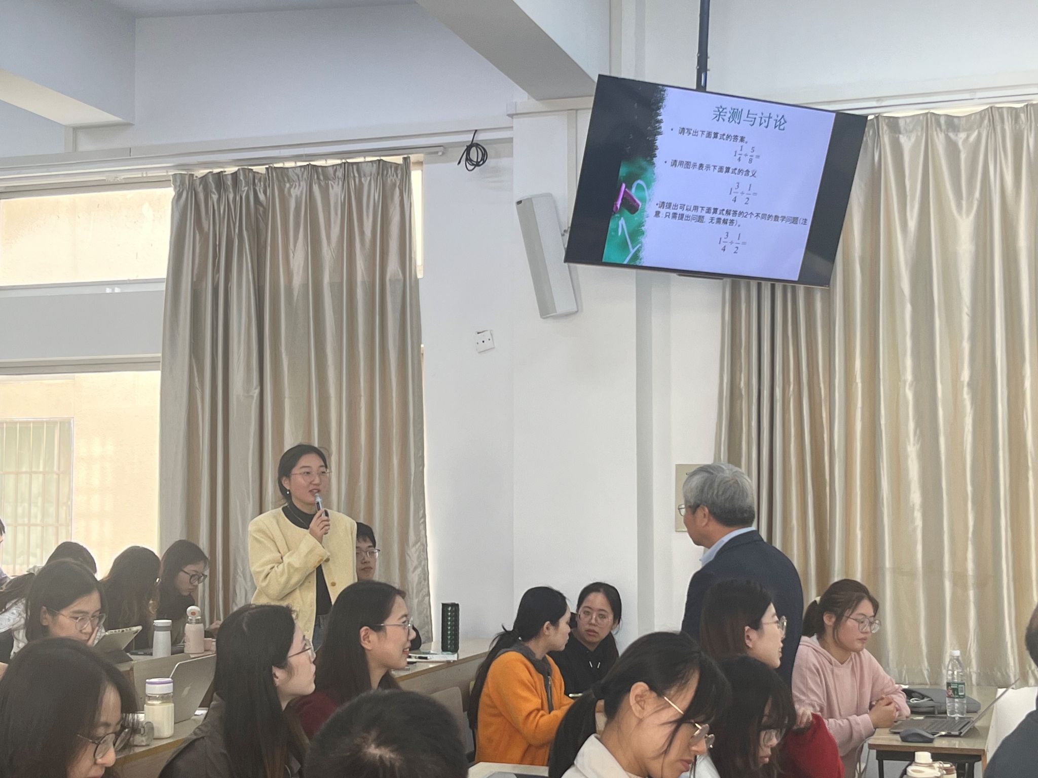 在提问总结环节,蔡教授提出:“适度的认知挑战与学生成绩提升呈现显著正相关。”他强调要通过精心设计的“问题提出”活动,培养学生“做数学”的思维品质,实现从机械运算到数学思维的跨越式发展。并就学生提出的“何以平衡双基与学生问题解决能力”“如何进行基于问题提出的教学任务设计”问题进行解答,蔡教授分享了具体的教学策略“引导学会围绕同一数学情境提出三个不同的数学问题”,培养学生的问题意识和思维能力。并建议研究生同学们多走进课堂、深入一线,通过系统研读优秀教师的教学案例,不断反思优化自己的教学实践,以此提升专业素养,为未来的教学工作打下坚实基础。