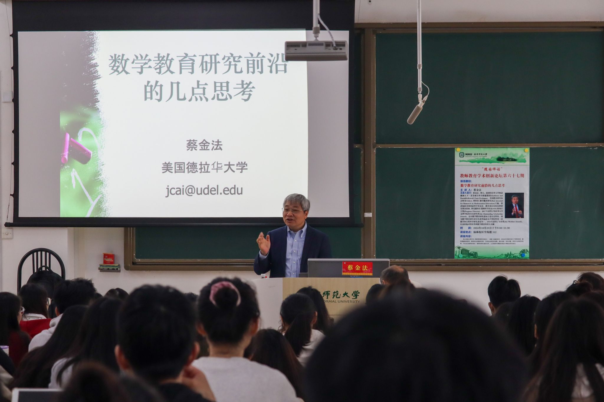 2024年10月25日上午,美国特拉华大学蔡金法教授在南京师范大学仙林校区学海楼312教室为师生们带来题为《数学教育研究前沿的几点思考》的讲座。本次讲座由中学数学教育研究室主任顾继玲教授主持,学科教学(数学)全体研究生、导师以及南京市中小学教研员和一线教师、部分校友共百余人参加。讲座围绕数学教育研究前沿议题展开深入探讨,重点阐述了四个核心主题:非认知因素对学生数学学习的影响、家长在数学学习中的参与、教师教学任务的设计以及问题提出的相关研究。