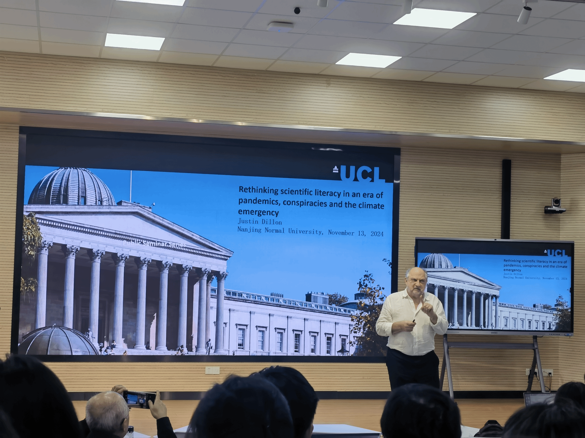 2024年11月13日上午,英国教授Justin Dillon在南京师范大学仙林校区学明楼502教室开展了以“重思‘科学素养’:在全球疫情、阴谋论、气候危机的时代”为题的学术分享。龚倩老师、张景璐老师组织本次讲座,张景璐老师主持了讲座并对Justin Dillon教授的到来表示热烈欢迎。吴伟老师、许立新老师、地理科学(师范)专业本科生、物理科学(师范)专业本科生、学科教学(地理)专业及学科教学(物理)专业研究生等百余名师生参加了本次活动。