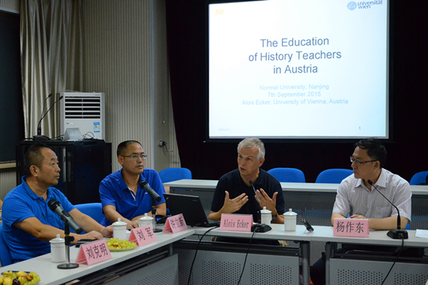紧接着,Ecker副教授重点介绍了历史教师的培养模式和历史教学。他从英国先学术性教育后历史教学法教育的先后顺序教师培养模式、奥地利的学术性与实践能力同时培养的同时性教师培养模式以及修完相应课程在不同教育机构学习的个性化教育培养模式中总结出历史教师的欧洲培养模式,引发了听众很大的启发和深思。Ecker副教授强调,奥地利的历史教师必须经过四年本科和两年实习才能成为教师,而他所任教的维也纳大学关注学术的同时,也重视中小学教育现实,在理论与实践的结合中,培养教师的教学能力、课堂决策能力和研究能力。Ecker副教授最后总结道,历史教学在多元化背景下对历史教师提出了新的挑战,总的趋势是要获得国家身份的认同,用历史教学去改变传统观念。