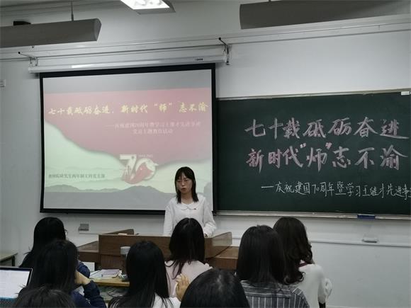 10月11日晚,博彩网址大全 研究生两年制文科党支部在南京师范大学仙林校区学明楼310顺利举行“七十载砥砺奋进,新时代‘师’志不渝”党员主题教育活动。本次活动旨在欢庆中华人民共和国成立七十周年,深...